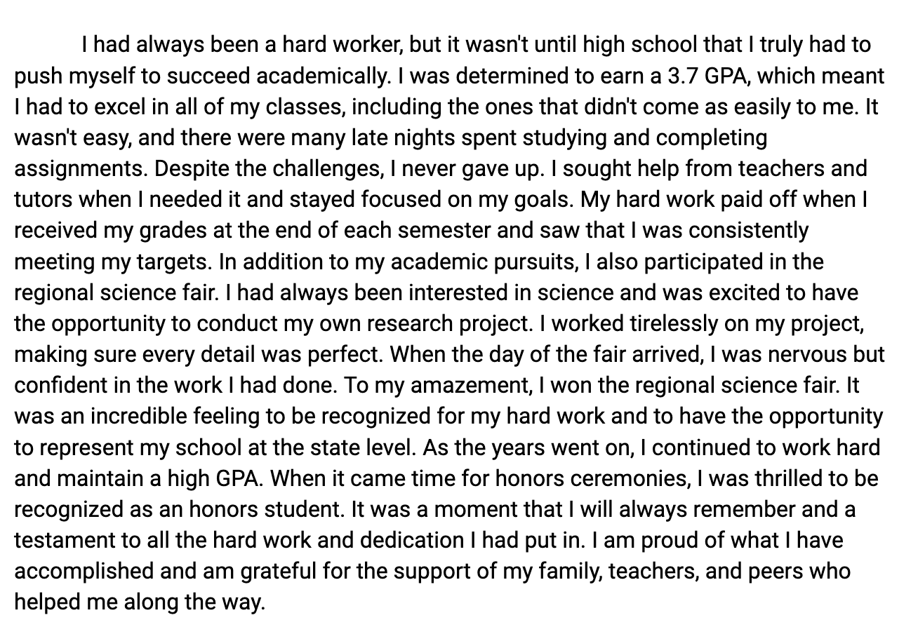 Write a narrative about having to work hard to earn a 3.7 GPA, winning the regional science fair, and the amazing feeling of being recognized as an honors student