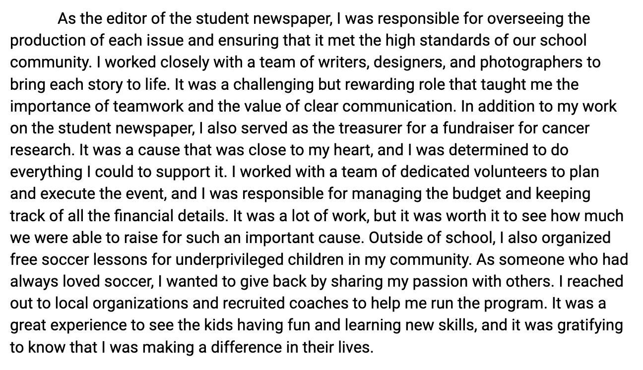 Write a narrative about being the editor of the student newspaper, being the treasurer for a fundraiser for cancer research, and organizing free soccer lessons for underprivileged children.